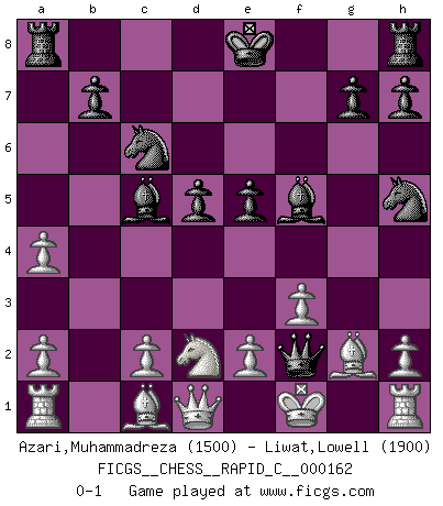 Last move : 0-1 2018 April 9 11:31:52 [Event "FICGS__CHESS__RAPID_C__000162"] [Site "FICGS"] [Date "2018.04.09"] [Round "1"] [White "Azari,Muhammadreza"] [Black "Liwat,Lowell"] [Result "0-1"] [WhiteElo "1500"] [BlackElo "1900"] 1.d4 c5 2.Nf3 cxd4 3.Nxd4 e5 4.Nb3 d5 5.N1d2 Nc6 6.g3 f5 7.Bg2 Nf6 8.f3 a5 9.g4 a4 10.Nc5 Bxc5 11.gxf5 Bxf5 12.b3 Nh5 13.bxa4 Qh4+ 14.Kf1 Qf2+ 0-1 Old Benoni defense Player Black won this chess game. Follow this game move after move (download)The sign of a great Master is his ability to win a won game quickly and painlessly. (Irving Chernev) Der 70jährige Viktor Kortschnoi: Die Rentenanstalt wollte mich zwingen in Rente zu gehen. Meine Frau erhält jetzt eine Pension- und ich zahle weiter in die Rentenkasse ein! (Viktor Kortschnoi) No volvere nunca a jugar contigo. Has insultado a mi amigo. - cuando un oponente se maldijo por una mala jugada (Miguel Najdorf) À la honte des hommes, on sait que les lois du jeu sont les seules qui soient partout justes, claires, inviolables et exécutées. Pourquoi l'Indien qui a donné les règles du jeu d'échecs est-il obéi de bon gré dans toute la terre, et que les décrétales des papes, par exemple, sont aujourd'hui un objet d'horreur et de mépris ? C'est que l'inventeur des échecs combina tout avec justesse pour la satisfaction des joueurs, et que les papes, dans leurs décrétales, n'eurent en vue que leur seul avantage. L'Indien voulut exercer également l'esprit des hommes et leur donner du plaisir; les papes ont voulu abrutir l'esprit des hommes. Voltaire (Dictionnaire philosophique / Garnier 1967) Tree pose grows confidence. It roots me to this world. (Terri Guillemets)