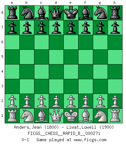Last move : 0-1 2018 May 9 22:58:35 [Event "FICGS__CHESS__RAPID_B__000271"] [Site "FICGS"] [Date "2018.04.09"] [Round "1"] [White "Anders,Jean"] [Black "Liwat,Lowell"] [Result "0-1"] [WhiteElo "1800"] [BlackElo "1900"] 0-1 This chess game has been lost on time (started : 2018.04.09 12:49:31) Player Black won this chess game. Follow this game move after move (download)I played Chess with him and would have beaten him sometimes only he always took back his last move, and ran the game out differently. (Mark Twain) Mit sehr nachdenklichem Gesicht schreitet Bobby durch den Turniersaal. Was ist passiert?, fragt Lombardy. Ich stehe schlecht, antwortet Fischer. Lombardy: Dann biete doch einfach Remis an. Fischer: So schlecht stehe ich nun auch wieder nicht! (Robert James Fischer) La táctica fluye a partir de una posición superior. (Bobby Fischer) Les Echecs ont trois composantes : le temps, l'espace et le matériel en dernier. (Mikhail Tal) Have no fear of perfection - you'll never reach it. (Salvador Dali)