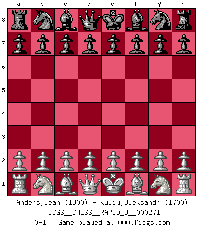 Last move : 0-1 2018 May 9 22:58:35 [Event "FICGS__CHESS__RAPID_B__000271"] [Site "FICGS"] [Date "2018.04.09"] [Round "1"] [White "Anders,Jean"] [Black "Kuliy,Oleksandr"] [Result "0-1"] [WhiteElo "1800"] [BlackElo "1700"] 0-1 This chess game has been lost on time (started : 2018.04.09 12:49:31) Player Black won this chess game. Follow this game move after move (download)Examine moves that smite! A good eye for smites is far more important than a knowledge of strategical principles. (Purdy) Es tut gut, die Entwicklungsperiode von, [...] demokratischem Geist durchdringen zu lassen. Wie undemokratisch wäre es doch beispielsweise, den einen Offizier große Spaziertouren vornehmen zu lassen, während die anderen zu Hause säßen und sich entsetzlich langweilten. (Aaron Nimzowitsch) Yo no creo en la psicología. Yo creo en las buenas movidas. (Bobby Fischer) On entre au jeu d'Echecs comme on entre en Religion. Pour le joueur d'Echecs, la partie d'Echecs c'est l'office, la messe, le défilé du 1er Mai, le dépôt de gerbe au Monument aux Morts. C'est un drame sacré. (Michel Roos) Vladimir Ras-Putin is still alive... He is also a good actor, I saw him in the Lord of the Rings. (Rodolfo d'Ettorre)