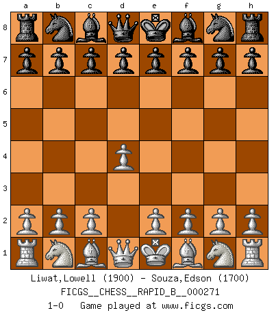 Last move : 1-0 2018 May 9 22:58:35 [Event "FICGS__CHESS__RAPID_B__000271"] [Site "FICGS"] [Date "2018.04.09"] [Round "1"] [White "Liwat,Lowell"] [Black "Souza,Edson"] [Result "1-0"] [WhiteElo "1900"] [BlackElo "1700"] 1.d4 1-0 This chess game has been lost on time (started : 2018.04.09 12:49:31) Queen's pawn Player White won this chess game. Follow this game move after move (download)By the beauty of his games, the clarity of his play, and the brilliance of his ideas, Fischer made himself an artist of the same stature as Brahms, Rembrandt, and Shakespeare. (David Levy) Mein Name ist Rustam Kamsky. Sie haben meinen Sohn belästigt. Bereiten Sie sich aufs Sterben vor. (Rustam Kamsky) Yo considero que Fischer es uno de los expertos mas grandes de aperturas de siempre. (Keith Hayward) Je crois qu'il existe des manières très spécifiques de jouer efficacement contre une machine. Evidemment, nous n'avons aucune chance en technique pure, parce que l'ordinateur calcule de manière parfaite. Mais lorsque nous faisons appel à notre cerveau, en utilisant l'intuition et la compréhension, alors nous restons beaucoup plus forts. (Anatoli Karpov) If things go wrong, don't go with them. (Roger Babson)