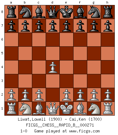 Last move : 1-0 2018 May 9 22:58:35 [Event "FICGS__CHESS__RAPID_B__000271"] [Site "FICGS"] [Date "2018.04.09"] [Round "1"] [White "Liwat,Lowell"] [Black "Cai,Ken"] [Result "1-0"] [WhiteElo "1900"] [BlackElo "1700"] 1.d4 1-0 This chess game has been lost on time (started : 2018.04.09 12:49:31) Queen's pawn Player White won this chess game. Follow this game move after move (download)You can only get good at Chess if you love the game. (Bobby Fischer) Offener Brief an US-Präsident Bush anlässlich der Verhaftung Bobby Fishers: Verhaften Sie mich. Stecken Sie mich in dieselbe Zelle wie Bobby Fisher und geben Sie uns ein Schachspiel mit. (Boris Vassilievich Spassky) El jugador de combinación piensa hacia adelante; comienza de la posición dada y trabaja las movidas contundentes en su mente. (Emanuel Lasker) Vous savez, camarade Pachman, je n'éprouve pas de plaisir à être ministre, je jouerais plutôt aux échecs comme vous, ou alors ferais une révolution au Venezuela. (Che Guevara à Ludek Pachman, 'Checkmate in Prague', 1975) To send light into the darkness of men's hearts - such is the duty of the artist. (Schumann)