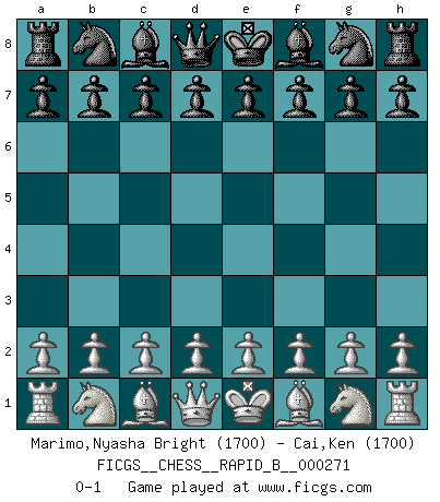 Last move : 0-1 2018 May 9 22:58:35 [Event "FICGS__CHESS__RAPID_B__000271"] [Site "FICGS"] [Date "2018.04.09"] [Round "1"] [White "Marimo,Nyasha Bright"] [Black "Cai,Ken"] [Result "0-1"] [WhiteElo "1700"] [BlackElo "1700"] 0-1 This chess game has been lost on time (started : 2018.04.09 12:49:31) Player Black won this chess game. Follow this game move after move (download)Chess is war over the board. The object is to crush the opponents mind. (Bobby Fischer) Ein Isolani verdüstert die Stimmung auf dem ganzen Schachbrett. (Savielly Grigorievitsch Tartakower) El Ajedrez es 99 por ciento táctica. (Teichmann) Le jeu d'échecs est comme rejeté hors du temps. (Antoine de Saint-Exupéry) If you know the enemy and know yourself you need not fear the results of a hundred battles. (Sun Tzu)