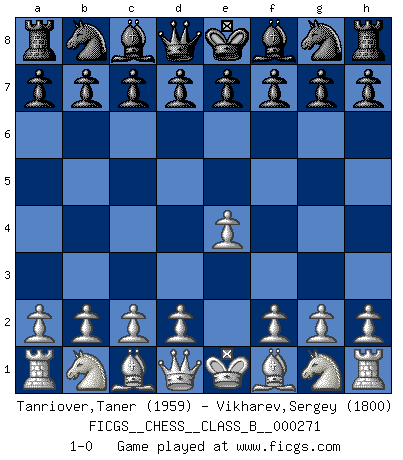 Last move : 1-0 2018 May 21 23:46:56 [Event "FICGS__CHESS__CLASS_B__000271"] [Site "FICGS"] [Date "2018.04.11"] [Round "1"] [White "Tanriover,Taner"] [Black "Vikharev,Sergey"] [Result "1-0"] [WhiteElo "1959"] [BlackElo "1800"] 1.e4 1-0 This chess game has been lost on time (started : 2018.04.11 21:32:33) King's pawn Opening Player White won this chess game. Follow this game move after move (download)It is the aim of the modern school, not to treat every position according to one general law, but according to the principle inherent in the position. (Richard Reti) Ich rechne überhaupt nicht voraus. Ich gewinne auch so. (Robert James Fischer) El Ajedrez es un terrible juego. Si no controlas el centro, tu oponente tiene una posición mas holgada. Si tienes control del centro, ¡entonces realmente tu tienes algo de que preocuparte!. (Siegbert Tarrasch) Un footballeur joue avec ses pieds, parfois avec sa tête. Un joueur d'échecs ne joue qu'avec sa tête. Et quand il ne joue plus, il meurt. (Jacob Murray) Excelling at chess has long been considered a symbol of more general intelligence. That is an incorrect assumption in my view, as pleasant as it might be. But for the purposes of argument and investigation, chess is, in Russkin-Gutman's words, 'an unparalleled laboratory, since both the learning process and the degree of ability obtained can be objectified and quantified, providing an excellent comparative framework on which to use rigorous analytical techniques.' (The Chess Master and the Computer, by Garry Kasparov - 2010)