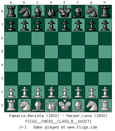 Last move : 0-1 2018 May 21 23:46:56 [Event "FICGS__CHESS__CLASS_B__000271"] [Site "FICGS"] [Date "2018.04.11"] [Round "1"] [White "Kamarie,Beniata"] [Black "Harper,Lena"] [Result "0-1"] [WhiteElo "1800"] [BlackElo "1800"] 0-1 This chess game has been lost on time (started : 2018.04.11 21:32:33) Player Black won this chess game. Follow this game move after move (download)I have never in my life played the French Defence, which is the dullest of all openings. (Wilhelm Steinitz) Habe Mut, dich deines eigenen Verstandes zu bedienen. (Immanuel Kant) El Ajedrez era la lengua materna de Capablanca. (Reti) On entre au jeu d'Echecs comme on entre en Religion. Pour le joueur d'Echecs, la partie d'Echecs c'est l'office, la messe, le défilé du 1er Mai, le dépôt de gerbe au Monument aux Morts. C'est un drame sacré. (Michel Roos) To err is human, but to really foul things up requires a computer. (Farmer's Almanac, 1978)