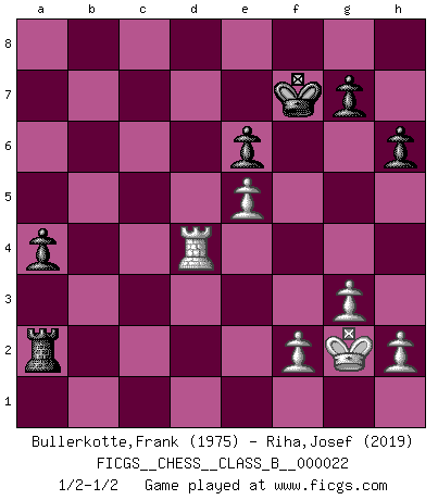 Last move : 1/2-1/2 2007 June 10 12:59:48 [Event "FICGS__CHESS__CLASS_B__000022"] [Site "FICGS"] [Date "2007.05.02"] [Round "1"] [White "Bullerkotte,Frank"] [Black "Riha,Josef"] [Result "1/2-1/2"] [WhiteElo "1975"] [BlackElo "2019"] 1.d4 Nf6 2.Nf3 e6 3.c4 d5 4.Nc3 Be7 5.Bg5 h6 6.Bh4 O-O 7.e3 b6 8.cxd5 Nxd5 9.Bxe7 Qxe7 10.Nxd5 exd5 11.Rc1 Be6 12.Qa4 c5 13.Qa3 Rc8 14.Be2 a5 15.dxc5 bxc5 16.Nd4 Na6 17.Bxa6 Rxa6 18.O-O Qd6 19.Nxe6 fxe6 20.Qc3 Rb6 21.Rfd1 a4 22.Rd2 Rcb8 23.g3 Rb4 24.R1c2 Qb6 25.Kg2 Rb7 26.e4 d4 27.Qxc5 Qxc5 28.Rxc5 Rxb2 29.Rxb2 Rxb2 30.Rc4 Rxa2 31.Rxd4 Kf7 32.e5 1/2-1/2 Queen's pawn game Kingside Castling by player Black (move 6) Kingside Castling by player White (move 18) This chess game ended in a draw. Follow this game move after move (download)Chess is a part of culture and if a culture is declining then Chess too will decline. (Mikhail Botvinnik) Es gibt Leute, die glauben, alles wäre vernünftig, was man mit einem ernsthaften Gesicht tut. (Georg Christoph Lichtenberg) ¿Quién es tu oponente esta tarde? Esta tarde mi oponente son las piezas negras. (Akiba Rubinstein) L'attaque fait le spectacle, la défense gagne les matchs. (Dicton footballistique) A specialist learns more and more about less and less until he knows everything about nothing. (Nicholas Murray Butler)