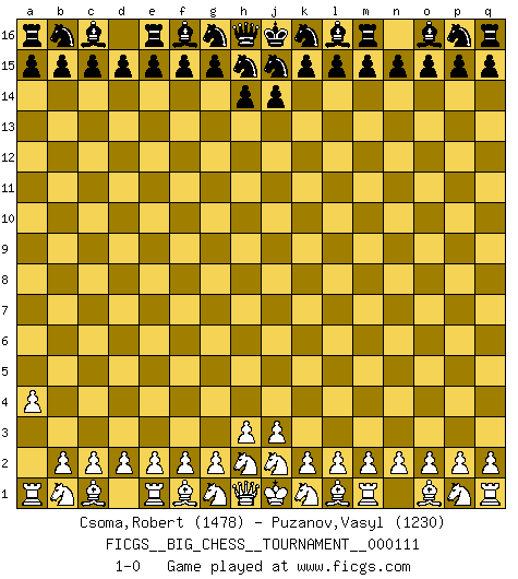 Last move : 1-0 2018 May 13 23:16:53 [Event "FICGS__BIG_CHESS__TOURNAMENT__000111"] [Site "FICGS"] [Date "2018.04.12"] [Round "1"] [White "Csoma,Robert"] [Black "Puzanov,Vasyl"] [Result "1-0"] [WhiteElo "1478"] [BlackElo "1230"] 1.a2-a4 1-0 This big chess game has been lost on time (started : 2018.04.12 9:13:0) Follow this game move after move (download)Half the variations which are calculated in a tournament game turn out to be completely superfluous. Unfortunately, no one knows in advance which half. (Jan Tinman) Über Kasparov: Es ist offensichtlich, daß er in einem totalitären Staat aufwuchs und deshalb zu diktatorischen Zügen neigt. (Viktor Kortschnoi) Siempre es mucho mejor sacrificar las piezas de tu oponente. (Savielly Tartakover) Assurément je connaissais par expérience le mystérieux attrait de ce jeu royal, le seul entre tous les jeux inventés par les hommes qui échappe souverainement à la tyrannie du hasard, le seul où l'on ne doive sa victoire qu'à son intelligence ou plutôt à une certaine forme d'intelligence. Mais n'est-ce pas déjà le limiter injurieusement que d'appeler les échecs un jeu ? N'est-ce pas une science, un art ou quelque chose qui, comme le cercueil de Mahomet entre ciel et terre, est suspendu entre l'un et l'autre, et qui réunit un nombre incroyable de contraires ? [...] C'est une pensée qui ne mène à rien, une mathématique qui n'établit rien, un art qui ne laisse pas d'uvre, une architecture sans matière; et il l'a prouvé néanmoins qu'il était plus durable, à sa manière, que les livres ou que tout autre monument, ce jeu unique qui appartient à tous les peuples et à tous les temps, et dont personne ne sait quel dieu en fit don à la terre pour tuer l'ennui, pour aiguiser l'esprit et stimuler l'âme. Où commence-t-il, où finit-il ? (Stefan Zweig) When I took office, only high energy physicists had ever heard of what is called the World Wide Web... Now even my cat has its own page. (Bill Clinton, 1996)