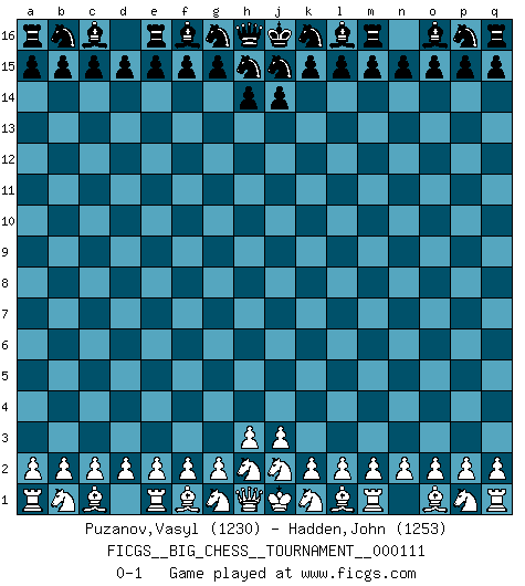 Last move : 0-1 2018 May 12 11:13:51 [Event "FICGS__BIG_CHESS__TOURNAMENT__000111"] [Site "FICGS"] [Date "2018.04.12"] [Round "1"] [White "Puzanov,Vasyl"] [Black "Hadden,John"] [Result "0-1"] [WhiteElo "1230"] [BlackElo "1253"] 0-1 This big chess game has been lost on time (started : 2018.04.12 9:13:0) Follow this game move after move (download)When you absolutely don't know what to do anymore, it is time to panic. (John van der Wiel) Ich tröste mich mit dem Vergnügen, daß Schachfans, Zuschauer und Leser glücklich sind, wenn ein Großmeister etwas riskiert, statt nur Klötzchen zu schieben. (Mikhail Nekhemyevich Tal) La caracteristica mas importante en la posición del Ajedrez es la actividad de las piezas. Esto es absolutamente fundamental en todas las fases del juego: Apertura, Juego Medio y especialmente Finales. La limitación primordial en la actividad de una pieza, es la estructuración de los Peones. (Michael Stean) Horreur, mais aussi harmonie suprême : qu'y avait-il en effet au monde en dehors des échecs ? Le brouillard, l'inconnu, le non-être... (Vladimir Nabokov) True nature is revealed in times of difficulty. (Chinese proverb)