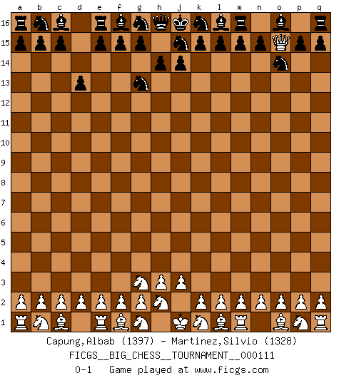 Last move : 0-1 2018 May 16 23:25:28 [Event "FICGS__BIG_CHESS__TOURNAMENT__000111"] [Site "FICGS"] [Date "2018.04.12"] [Round "1"] [White "Capung,Albab"] [Black "Martinez,Silvio"] [Result "0-1"] [WhiteElo "1397"] [BlackElo "1328"] 1.j2-g3 d15-d13 2.h1-o7 h15-g13 3.o7-o15 p16-o14 0-1 This big chess game has been lost on time (started : 2018.04.12 9:13:0) Follow this game move after move (download)Chess is a matter of delicate judgment, knowing when to punch and how to duck. (Bobby Fischer) Es war undenkbar für die Behörden, dass ein sowjetischer Großmeister auf diese Art und Weise [Fischer-Taimanov 6:0] verliert, ohne dass es eine politischer Erklärung dafür gäbe. (Mark Taimanov) La batalla por la última verdad nunca sera ganada. Y es por eso que el Ajedrez es tan fascinante. (Hans Kmoch) J'apprécie les joueurs d'est-indienne, c'est grâce à eux que je nourris ma famille depuis tant d'années. (Petrosian) Men never do evil so completely and cheerfully as when they do it from religious conviction. (Blaise Pascal)