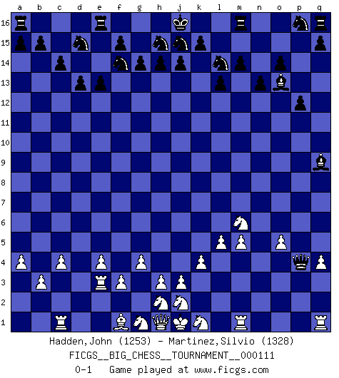 Last move : 0-1 2018 June 10 23:18:43 [Event "FICGS__BIG_CHESS__TOURNAMENT__000111"] [Site "FICGS"] [Date "2018.04.12"] [Round "1"] [White "Hadden,John"] [Black "Martinez,Silvio"] [Result "0-1"] [WhiteElo "1253"] [BlackElo "1328"] 1.k2-k4 c15-c14 2.l1-k2 g15-g14 3.d2-d4 o15-o14 4.g2-g4 l15-l13 5.e2-e4 h16-d12 6.n2-n3 d12-d4 7.f2-f3 d4-f2 8.e1-e2 f2-l7 9.o1-m3 e15-e13 10.o2-o4 p15-p13 11.k2-n5 l7-l12 12.l2-l3 n15-n13 13.b2-b3 o16-q14 14.a2-a4 g16-f14 15.m3-o5 d15-d13 16.c1-e3 f16-c13 17.p1-o3 c16-o5 18.q2-q3 k16-l14 19.c2-c4 p13-p12 20.p2-p4 o5-n6 21.o4-o5 n6-q9 22.m2-m4 m15-m14 23.n3-n4 b16-d15 24.m4-m5 q14-e3 25.e2-e3 c13-h8 26.b1-c3 l12-m12 27.l3-l4 h8-c3 28.a1-c1 c3-j9 29.l4-l5 j9-n5 30.o3-n5 l16-o13 31.q3-q4 m12-n11 32.n5-l4 n11-n4 33.l4-m6 n4-p4 0-1 Follow this game move after move (download)The older I grow, the more I value Pawns. (Keres) Ich brauche nur einen Blick auf das Schachbrett zu werfen, und weiß schon, was in der Stellung steckt, was geschehen kann und was geschehen wird. Alle übrigen suchen und prüfen, ich aber weiß es! (José Raúl Capablanca) Una partida de Ajedrez se divide en 3 etapas: la primera cuando piensas que tienes la ventaja, la segunda cuando crees que tienes la ventaja y la tercera... ¡cuando te das cuenta que vas a perder!. (Savielly Tartakower) Tout change constamment, y compris dans le monde des Echecs. (Botvinnik) The general who wins the battle makes many calculations in his temple before the battle is fought. The general who loses makes but few calculations beforehand. (Sun Tzu)