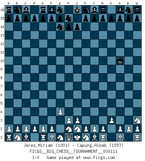 Last move : 1-0 2018 May 16 11:23:53 [Event "FICGS__BIG_CHESS__TOURNAMENT__000111"] [Site "FICGS"] [Date "2018.04.12"] [Round "1"] [White "Jerez,Miriam"] [Black "Capung,Albab"] [Result "1-0"] [WhiteElo "1301"] [BlackElo "1397"] 1.n2-n3 j15-g14 2.g2-g4 h16-o10 3.p1-q3 1-0 This big chess game has been lost on time (started : 2018.04.12 9:13:0) Follow this game move after move (download)Chess is a fairy tale of 1001 blunders. (Savielly Tartakower) Wie bekannt hörte Morphy 1859 auf, Schach zu spielen. Seine Enttäuschung galt nicht so sehr dem Schach, wie den Schachspielern. (Robert James Fischer) El Ajedrez es tan interesante por sí solo, que no es necesario un interés monetario para persuadir a una persona a que lo practique; por lo tanto, nunca se juega por dinero. (Benjamin Franklin) Le thème de l'attaque double intervient d'une manière ou d'une autre dans l'immense majorité des combinaisons. (Youri Averbakh) There are 10 types of people in this world: those who understand binary and those who don't. (Anonymous)
