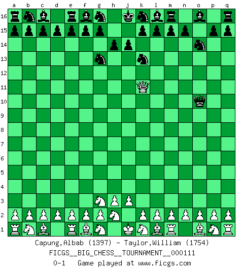Last move : 0-1 2018 May 17 11:25:44 [Event "FICGS__BIG_CHESS__TOURNAMENT__000111"] [Site "FICGS"] [Date "2018.04.12"] [Round "1"] [White "Capung,Albab"] [Black "Taylor,William"] [Result "0-1"] [WhiteElo "1397"] [BlackElo "1754"] 1.j2-g3 j15-k13 2.h1-o7 h15-g13 3.o7-o15 p16-o14 4.o15-k11 h16-o10 0-1 This big chess game has been lost on time (started : 2018.04.12 9:13:0) Follow this game move after move (download)Capture of the adverse King is the ultimate but not the first object of the game. (William Steinitz) Jede Eröffnung ist gut genug um gespielt zu werden, wenn nur ihr Ruf schlecht genug ist. (Savielly Grigorievitsch Tartakower) La vida es como un juego de Ajedrez, cambiando con cada movimiento. (Proverbio Chino) RxDa4 pat (...) God is an atheist. (Unknown)