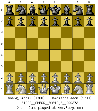 Last move : 0-1 2018 May 12 23:14:11 [Event "FICGS__CHESS__RAPID_B__000272"] [Site "FICGS"] [Date "2018.04.12"] [Round "1"] [White "Sheng,Giorgi"] [Black "Dampierre,Jean"] [Result "0-1"] [WhiteElo "1700"] [BlackElo "1700"] 0-1 This chess game has been lost on time (started : 2018.04.12 15:26:31) Player Black won this chess game. Follow this game move after move (download)You know you're going to lose. Even when I was ahead I knew I was going to lose. - On playing against Fischer. (Andrew Soltis) Karpov ist ein Museumsstück. (Garry Kasparov) ¡Examina movidas que hagan daño! Un buen ojo for movidas desvastantes es mucho mas importante que el conocimiento de principios estratégicos. (Purdy) Même si vous avez un bon coup à faire, regardez toujours s'il n'y en a pas un qui lui soit préférable. (Pedro Damiano) There is far too much law for those who can afford it and far too little for those who cannot. (Derek Bok)