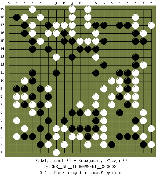 Last move : 0-1 2006 October 15 18:57:37 [Event "FICGS__GO__TOURNAMENT__000003"] [Site "FICGS"] [Date "2006.06.03"] [Round "1"] [Black "Vidal,Lionel"] [White "Kobayashi,Tetsuya"] [Result "0-1"] 1.r16 d16 2.q3 c4 3.p17 r10 4.r5 k3 5.r12 r7 6.k16 s16 7.r15 p10 8.f17 h17 9.h16 j16 10.j15 j17 11.k17 g16 12.h15 g17 13.c17 f16 14.c16 k15 15.k14 l15 16.m17 m16 17.n17 l17 18.j13 c10 19.e4 g4 20.c3 b3 21.d3 b5 22.f5 d6 23.e7 d7 24.d8 c8 25.d10 f7 26.e6 e8 27.f8 d9 28.e9 n3 29.p6 r17 30.q17 r18 31.s15 t17 32.j4 j3 33.g2 h2 34.o2 n5 35.n7 n2 36.q9 r9 37.q10 r11 38.q11 s12 39.r13 q8 40.p8 s6 41.q7 s5 42.s4 r8 43.m4 n4 44.l3 m3 45.k4 l2 46.l4 h4 47.h5 f2 48.f3 g3 49.e2 g1 50.d11 m13 51.k18 l18 52.l16 j18 53.l14 m15 54.m14 l6 55.k6 k7 56.j6 m7 57.m5 n6 58.m6 g13 59.g11 f9 60.d8 o7 61.n8 e8 62.k19 l19 63.d8 o8 64.o9 e8 65.n15 j19 66.d8 n9 67.c9 m8 68.c7 b8 69.b9 b7 70.d15 d17 71.d18 e18 72.f14 e15 73.d14 c18 74.b18 d19 75.n12 s3 76.r3 t4 77.s2 r4 78.p3 p9 79.p11 o10 80.m11 t2 0-1 Here are the names of the openings (joseki) played in the four corners : Corner d16 : d16 f17 Hoshi (Hwajeom, Seongjeom, Xingwei`) 4-4 Point. The star or hoshi (4-4) point, emphasizing influence at the potential expense of territory. Ikken Kakari (Hankan Keolch'im, Yi Gua`jiao~, 1-Space Low Approach). Black 2 is the standard approach move to the 4-4. Corner d4 : c4 e4 Komoku (Somok, Xiao~mu`) 3-4 Point. The komoku (3-4) point is the traditional corner enclosure move.. Ikken Takagakari (Hankan Nop'dakeolch'im, Yi Gaogua`jiao~, 1-Space High Approach). The 5-4 approach move has become more popular in modern times, as modern Go emphasizes speed and influence. Player White won this Go (weiqi, baduk) game. Follow this game move after move (download)Capture what you cut off. (Anonymous) Wipe them out. All of them. (Darth Sidious in Star Wars ep.1)