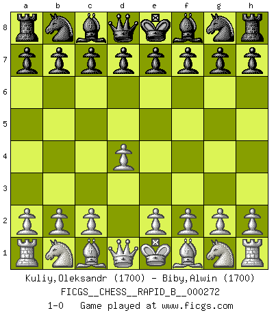 Last move : 1-0 2018 May 12 23:14:11 [Event "FICGS__CHESS__RAPID_B__000272"] [Site "FICGS"] [Date "2018.04.12"] [Round "1"] [White "Kuliy,Oleksandr"] [Black "Biby,Alwin"] [Result "1-0"] [WhiteElo "1700"] [BlackElo "1700"] 1.d4 1-0 This chess game has been lost on time (started : 2018.04.12 15:26:31) Queen's pawn Player White won this chess game. Follow this game move after move (download)Half the variations which are calculated in a tournament game turn out to be completely superfluous. Unfortunately, no one knows in advance which half. (Jan Tinman) Ein Schachgenie ist jemand der verdammt gut Schach spielt. (Jonathan Levitt) Hoy en día, si tu no eres un Gran Maestro a los 14 años, es mejor que lo olvides. (Anand Viswanathan) Pour moi, les échecs ne sont pas un jeu mais un art. (Alexandre Alekhine) Difficult things take a long time, impossible things a little longer. (Author unknown)