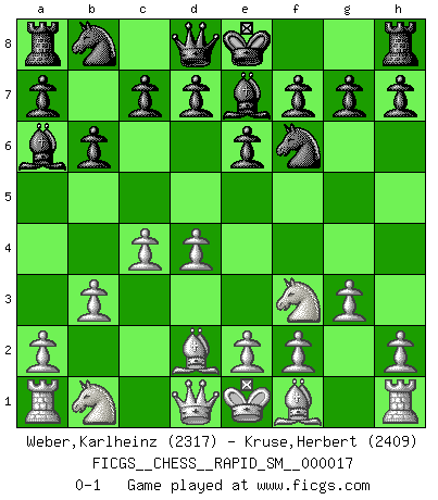 Last move : 0-1 2018 May 19 23:36:18 [Event "FICGS__CHESS__RAPID_SM__000017"] [Site "FICGS"] [Date "2018.04.13"] [Round "1"] [White "Weber,Karlheinz"] [Black "Kruse,Herbert"] [Result "0-1"] [WhiteElo "2317"] [BlackElo "2409"] 1.d4 Nf6 2.c4 e6 3.Nf3 b6 4.g3 Ba6 5.b3 Bb4+ 6.Bd2 Be7 0-1 This chess game has been lost on time (started : 2018.04.13 22:35:33) Queen's Indian : Nimzovich variation (exaggerated Fianchetto) Player Black won this chess game. Follow this game move after move (download)Even the laziest King flees wildly in the face of a double check ! (Aaron Nimzowitsch) Sie führen leise Selbstgespräche, schlürfen lautstark ihre Getränke, schmatzen hörbar beim Essen, blasen ihrem Gegenüber Rauch in die Augen, niesen ihm ins Gesicht, starren ihn unverwandt an, bis er sich unter ihren Blicken windet, rutschen ständig auf ihrem Stuhl hin und her, rülpsen und bohren in der Nase. (Anonymous) Un juego de Ajedrez es un dialogo, una conversación entre un jugador y su oponente. Cada movimiento del oponente puede contener amenazas o tropiezos, pero un jugador no se puede defender de las amenazas o tomar ventaja de los tropiezos si es que no se pregunta a sí mismo: ¿Que es lo que mi oponente va a hacer después de cada movida?. (Bruce A. Moon) Les Echecs mettent en conflit, non pas deux intelligences, mais deux volontés. (Lasker) They say in chess you've got to kill the queen, and then you mate it... Oh I, do you ? (Red Hot Chili Peppers, Fortune faded)