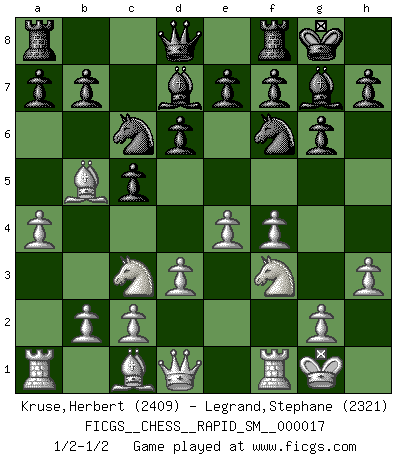 Last move : 1/2-1/2 2018 April 17 20:22:2 [Event "FICGS__CHESS__RAPID_SM__000017"] [Site "FICGS"] [Date "2018.04.13"] [Round "1"] [White "Kruse,Herbert"] [Black "Legrand,Stephane"] [Result "1/2-1/2"] [WhiteElo "2409"] [BlackElo "2321"] 1.e4 c5 2.Nc3 d6 3.f4 Nc6 4.Nf3 g6 5.Bb5 Bd7 6.O-O Bg7 7.d3 Nf6 8.a4 O-O 9.h3 1/2-1/2 Sicilian : Closed Kingside Castling by player White (move 6) Kingside Castling by player Black (move 8) This chess game ended in a draw. Follow this game move after move (download)White lost because he failed to remember the right continuation and had to think up the moves himself. (Siegbert Tarrasch) Wer der Ansicht ist, daß alle Schachspieler verrückt sind, wird durch Studium des Lebens von Emil Josef Diemer nicht auf andere Gedanken kommen. (Hans Ree) La mitad de las variaciones que son calculadas en una partida de torneo, resultan ser completamente superfluas. Desafortunadamente, nadie sabe por adelantado cual mitad. (Jan Tinman) Aux échecs, l'amour-propre est satisfait quand on remporte la victoire, mais il n'y a pas de honte à être battu. (Benjamin Franklin) Tree pose grows confidence. It roots me to this world. (Terri Guillemets)