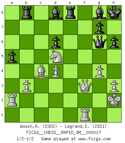Last move : 1/2-1/2 2018 July 14 14:25:26 [Event "FICGS__CHESS__RAPID_SM__000017"] [Site "FICGS"] [Date "2018.04.13"] [Round "1"] [White "Wosch,Arkadiusz"] [Black "Legrand,Stephane"] [Result "1/2-1/2"] [WhiteElo "2302"] [BlackElo "2321"] 1.e4 c5 2.Nf3 Nc6 3.d4 cxd4 4.Nxd4 Nf6 5.Nc3 e5 6.Ndb5 d6 7.Bg5 a6 8.Na3 b5 9.Nd5 Be7 10.Bxf6 Bxf6 11.c3 O-O 12.Nc2 Bg5 13.a4 bxa4 14.Rxa4 a5 15.Bc4 Rb8 16.b3 Kh8 17.O-O f5 18.exf5 Bxf5 19.Nce3 Bg6 20.Qe2 e4 21.Nc2 Qc8 22.Nce3 Qd8 23.Nc2 Qc8 24.Nd4 Nxd4 25.cxd4 Bd8 26.Qe3 Qg4 27.R4a1 h6 28.h3 Qh4 29.Ra2 Re8 30.Kh2 Bf7 31.g3 Qh5 32.g4 Qg6 33.f4 exf3 34.Qxf3 Bg8 1/2-1/2 Sicilian : Pelikan (Lasker/Sveshnikov) variation Kingside Castling by player Black (move 11) Kingside Castling by player White (move 17) This chess game ended in a draw. Follow this game move after move (download)Methodical thinking is of more use in Chess than inspiration. (C. J. S. Purdy) Die Fehler sind da, Sie warten nur darauf gemacht zu werden. (Savielly Grigorievitsch Tartakower) Todos los jugadores de Ajedrez deberían tener un pasatiempo. (Savielly Tartakower) C'est la seule position que je connaisse où les deux camps sont mals. Propos prêtés à V. Anand. 98% of all statistics are made up. (Author unknown)