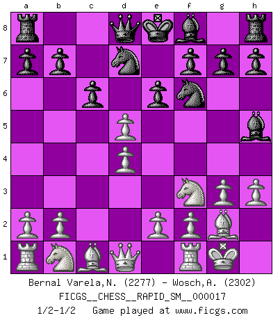 Last move : 1/2-1/2 2018 April 29 19:17:35 [Event "FICGS__CHESS__RAPID_SM__000017"] [Site "FICGS"] [Date "2018.04.13"] [Round "1"] [White "Bernal Varela,Nelson"] [Black "Wosch,Arkadiusz"] [Result "1/2-1/2"] [WhiteElo "2277"] [BlackElo "2302"] 1.Nf3 Nf6 2.g3 d5 3.Bg2 c6 4.O-O Bg4 5.h3 Bh5 6.c4 e6 7.d4 Nbd7 8.cxd5 1/2-1/2 Reti Opening Kingside Castling by player White (move 4) This chess game ended in a draw. Follow this game move after move (download)The Chess pieces are the block alphabet which shapes thoughts; and these thoughts, although making a visual design on the chessboard, express their beauty abstractly, like a poem. (Marcel Duchamp) Privat ist Kortschnoi kein schlechter Mensch, sehr sympathisch. Aber während des Spiels ist er grausam. Er will dich töten. (Miguel Najdorf) El tablero es el mundo, las piezas es el fenomeno del universo, las reglas del juego son lo que llamamos leyes de la naturaleza y el jugador del lado opuesto, se encuentra oculto a nuestra vista. (Thomas Huxley) Les échecs, c'est l'art d'analyser. (Mikhail Botvinnik) Chess, like love, like music, has the power to make people happy. (Siegbert Tarrasch)