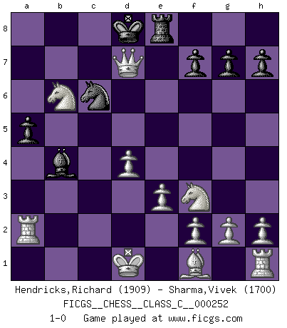 Last move : 1-0 2018 April 23 15:2:43 [Event "FICGS__CHESS__CLASS_C__000252"] [Site "FICGS"] [Date "2018.04.14"] [Round "1"] [White "Hendricks,Richard"] [Black "Sharma,Vivek"] [Result "1-0"] [WhiteElo "1909"] [BlackElo "1700"] 1.d4 d5 2.c4 Nc6 3.Nc3 Nf6 4.Nf3 Qd6 5.Nb5 Qb4+ 6.Bd2 Qxb2 7.Bc3 Qa3 8.Nxa3 e6 9.Nb5 Ne4 10.Nxc7+ Kd8 11.Nxa8 Nxc3 12.Qb3 Bb4 13.e3 Nxa2 14.Kd1 b6 15.Rxa2 a5 16.cxd5 exd5 17.Qxd5+ Bd7 18.Nxb6 Re8 19.Qxd7+ 1-0 QGD : Chigorin defense Player White won this chess game. Follow this game move after move (download)Avoid the crowd. Do your own thinking independently. Be the Chess player, not the Chess piece. (Ralph Charell) Kein Großmeister ist normal. Sie unterscheiden sich nur im Ausmaß Ihrer Verrücktheit. (Viktor Kortschnoi) No es suficiente ser un buen jugador, se debe también de jugar bién. (Siegbert Tarrasch) Demandez au pauvre Cg1 ce qu'il en pense. Eduard Gufeld à propos de la variante Saemisch de l'Est-Indienne. If you are good, you will be assigned all the work. If you are really good, you will get out of it. (Dan Rotaru)