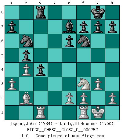 Last move : 1-0 2018 August 10 21:59:20 [Event "FICGS__CHESS__CLASS_C__000252"] [Site "FICGS"] [Date "2018.04.14"] [Round "1"] [White "Dyson,John"] [Black "Kuliy,Oleksandr"] [Result "1-0"] [WhiteElo "1934"] [BlackElo "1700"] 1.Nf3 d5 2.g3 Nf6 3.Bg2 c5 4.O-O Nc6 5.d4 e6 6.c4 Be7 7.dxc5 Bxc5 8.a3 O-O 9.b4 Be7 10.Bb2 dxc4 11.Nbd2 b5 12.Ne5 Nxe5 13.Bxa8 Qc7 14.Rc1 Ned7 15.Bh1 Bb7 16.Bxb7 Qxb7 17.Qc2 Rc8 18.Qc3 Nb6 19.Qf3 Qxf3 20.Nxf3 1-0 Reti : King's Indian attack (Barcza system) Kingside Castling by player White (move 4) Kingside Castling by player Black (move 8) Player White won this chess game. Follow this game move after move (download)Nonsense was the last thing Fischer was interested in, as far as Chess was concerned. (Elie Agur) Schach ist wie eine schöne Frau, zu der wir ständig zurückkehren, gleichviel, wie oft sie uns zurückweist. (Anonymous) La partida mas dura de ganar es una partida ganada. (Emanuel Lasker) Les Echecs sont et restent toujours un combat, un combat intégral comme la boxe, la lutte ou un autre sport, et où il doit y avoir un vainqueur et un vaincu. (Joseph Emil Diemer) To steal ideas from one person is plagiarism. To steal from many is research. (Unknown)