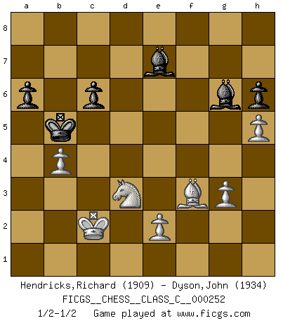Last move : 1/2-1/2 2018 August 19 20:20:36 [Event "FICGS__CHESS__CLASS_C__000252"] [Site "FICGS"] [Date "2018.04.14"] [Round "1"] [White "Hendricks,Richard"] [Black "Dyson,John"] [Result "1/2-1/2"] [WhiteElo "1909"] [BlackElo "1934"] 1.d4 d5 2.c4 c6 3.Nf3 Nf6 4.Nc3 dxc4 5.a4 Bf5 6.Ne5 Nbd7 7.Nxc4 Qc7 8.g3 e5 9.dxe5 Nxe5 10.Bf4 Nfd7 11.Bg2 f6 12.O-O g5 13.Nxe5 gxf4 14.Nxd7 Qxd7 15.a5 fxg3 16.fxg3 a6 17.Be4 Bh3 18.Qxd7+ Bxd7 19.Rxf6 O-O-O 20.Kg2 h6 21.Bf3 Rh7 22.Rf4 Be7 23.Rd1 Rg7 24.b4 Kc7 25.Kf2 Bg5 26.Rc4 Be6 27.Rxd8 Bxd8 28.Bd5 Bd7 29.Na4 Rg4 30.Rxg4 Bxg4 31.Bf3 Bc8 32.Ke3 Be7 33.Nc5 b6 34.axb6+ Kxb6 35.Kd4 Kb5 36.Nd3 Bd7 37.Kc3 Bf6+ 38.Kb3 Be8 39.Kc2 Bg6 40.h4 Be7 41.h5 1/2-1/2 QGD Slav : Krause attack Kingside Castling by player White (move 12) Queenside Castling by player Black (move 19) This chess game ended in a draw. Follow this game move after move (download)One bad move nullifies forty good ones. (Horowitz) Es genügt nicht ein guter Spieler zu sein, man muß auch gut spielen. (Siegbert Tarrasch) El Ajedrez es parte de una cultura y si una cultura esta en decadencia, entonces también el Ajedrez declinará. (Mikhail Botvinnik) Les échecs, c'est l'art d'analyser. (Mikhail Botvinnik) Chess is everything: art, science and sport. (Anatoly Karpov)