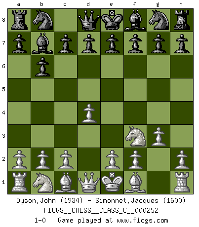Last move : 1-0 2018 May 25 0:0:40 [Event "FICGS__CHESS__CLASS_C__000252"] [Site "FICGS"] [Date "2018.04.14"] [Round "1"] [White "Dyson,John"] [Black "Simonnet,Jacques"] [Result "1-0"] [WhiteElo "1934"] [BlackElo "1600"] 1.Nf3 b6 2.d4 Bb7 3.g3 1-0 This chess game has been lost on time (started : 2018.04.14 11:44:14) Reti Opening Player White won this chess game. Follow this game move after move (download)All I want to do, ever, is just play Chess. (Bobby Fischer) Im Blitz ist es einfacher mit einer Figur weniger anzugreifen, als sich mit einer Mehrfigur zu verteidigen. (Mikhail Nekhemyevich Tal) En partidas rápidas, el Caballo es mas poderoso que el Alfil. (Vlastimil Hort) Les échecs sont un jeu par leur forme, un art par leur essence et une science par sa difficulté d'acquisition. Ils peuvent vous procurer autant de plaisir qu'un bon livre ou une belle musique, mais vous n'aurez une réelle joie que si vous arrivez à bien jouer. (Tigran Petrosian) There are two types of people in this world, good and bad. The good sleep better, but the bad seem to enjoy the waking hours much more. (Woody Allen)