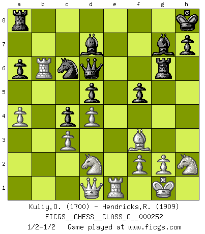 Last move : 1/2-1/2 2018 May 13 7:22:59 [Event "FICGS__CHESS__CLASS_C__000252"] [Site "FICGS"] [Date "2018.04.14"] [Round "1"] [White "Kuliy,Oleksandr"] [Black "Hendricks,Richard"] [Result "1/2-1/2"] [WhiteElo "1700"] [BlackElo "1909"] 1.d4 Nf6 2.Bf4 d5 3.e3 c5 4.c3 Nc6 5.Nd2 Bf5 6.Ngf3 Qb6 7.Nh4 Bd7 8.Qb3 c4 9.Qc2 Nh5 10.Bg3 Nxg3 11.hxg3 g6 12.e4 e6 13.Be2 Bg7 14.Nhf3 Qa5 15.O-O O-O 16.g4 b5 17.a3 f6 18.Rfe1 Qc7 19.Nh2 Qd6 20.Bf3 f5 21.gxf5 gxf5 22.exd5 exd5 23.b3 Kh8 24.Rab1 Rf6 25.bxc4 bxc4 26.a4 a6 27.Qd1 Rg6 28.Rb6 1/2-1/2 Queen's pawn game Kingside Castling by player White (move 15) Kingside Castling by player Black (move 15) This chess game ended in a draw. Follow this game move after move (download)I know people who have all the will in the world, but still can't play good Chess. (Bobby Fischer) Meine Liebe ist Schach, Schach, Schach. Ich muss jeden Tag Schach spielen, deshalb fühle ich mich so stark. (Miguel Najdorf) Haz el enroque temprano y seguido. (Rob Sillars) On n'a jamais que l'âge auquel on a commence à jouer aux échecs car après on cesse de vieillir. (Capablanca) I think your argument is specious - I think your tie is ugly. (Gregory House to Dr. Foreman, House M.D.)