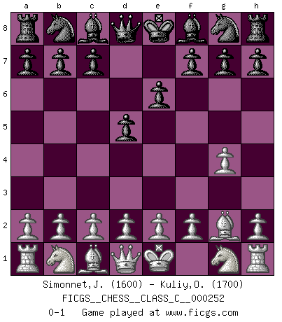 Last move : 0-1 2018 May 31 0:31:30 [Event "FICGS__CHESS__CLASS_C__000252"] [Site "FICGS"] [Date "2018.04.14"] [Round "1"] [White "Simonnet,Jacques"] [Black "Kuliy,Oleksandr"] [Result "0-1"] [WhiteElo "1600"] [BlackElo "1700"] 1.g4 d5 2.Bg2 e6 0-1 This chess game has been lost on time (started : 2018.04.14 11:44:14) Grob's attack Player Black won this chess game. Follow this game move after move (download)Pawn endings are to Chess what putting is to golf. (Cecil Purdy) Fischer: 'Remis!?' Uhlmann: 'Aber es muss doch dreimal Zugwiederholung sein!' Fischer: 'Sie nehmen das Remis an, wie ich es sage, sonst spiele ich weiter und werde Sie dann schlagen!' (Robert James Fischer) El muchacho (en ese entonces un niño de 12 años llamado Anatoly Karpov) no tiene ni idea de lo que es el Ajedrez y no hay futuro en absoluto para el en esta profesión. (Mikhail Botvinnik) Mais l'homme est une créature légère et illogique : semblable au joueur d'échecs, il n'aime que le processus du but à atteindre, non le but lui-même. (Dostoïevsky) The ego is not master in its own house. (Sigmund Freud)