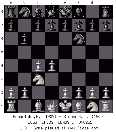 Last move : 1-0 2018 May 25 12:6:13 [Event "FICGS__CHESS__CLASS_C__000252"] [Site "FICGS"] [Date "2018.04.14"] [Round "1"] [White "Hendricks,Richard"] [Black "Simonnet,Jacques"] [Result "1-0"] [WhiteElo "1909"] [BlackElo "1600"] 1.d4 Nf6 2.c4 b6 3.Nc3 1-0 This chess game has been lost on time (started : 2018.04.14 11:44:14) Queen's Indian Accelerated Player White won this chess game. Follow this game move after move (download)I guess a certain amount of temperament is expected of Chess geniuses. (Ron Gross) Schach verlangt totale Konzentration. (Robert James Fischer) En un gambito tu regalas un Peón por el bién de tomar un juego perdido. (Samuel Standige Boden) Je menace de comprendre la position. (Anonyme) Faith : not wanting to know what is true. (Friedrich Nietzsche)