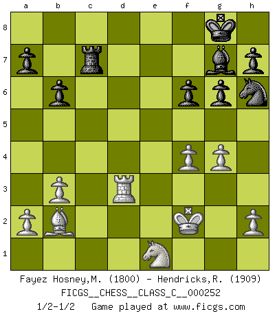 Last move : 1/2-1/2 2018 August 16 0:44:43 [Event "FICGS__CHESS__CLASS_C__000252"] [Site "FICGS"] [Date "2018.04.14"] [Round "1"] [White "Fayez Hosney,Mohammed"] [Black "Hendricks,Richard"] [Result "1/2-1/2"] [WhiteElo "1800"] [BlackElo "1909"] 1.f4 d5 2.Nf3 g6 3.e3 Bg7 4.d4 Nf6 5.Bd3 c5 6.c3 O-O 7.O-O b6 8.Nbd2 Ba6 9.Bxa6 Nxa6 10.Qe2 Qc8 11.Ne5 Ne8 12.b3 Nd6 13.c4 Qb7 14.Bb2 e6 15.Rac1 Rac8 16.Rfd1 Rfe8 17.Ndf3 Ne4 18.Nd2 Nd6 19.Ndf3 cxd4 20.cxd5 exd5 21.Bxd4 Nf5 22.Rxc8 Rxc8 23.Qd2 f6 24.Nd3 Qf7 25.Nf2 Nc5 26.Bb2 Ne4 27.Qxd5 Qxd5 28.Rxd5 Nxe3 29.Rd3 Nxf2 30.Kxf2 Nf5 31.Ne1 Rc7 32.g4 Nh6 1/2-1/2 Bird's Opening Kingside Castling by player Black (move 6) Kingside Castling by player White (move 7) This chess game ended in a draw. Follow this game move after move (download)It is not a move, even the best move that you must seek, but a realizable plan. (Eugene Znosko-Borovsky) Obwohl ich vom Stil her kaum zu den Priestern der Schachkunst gezählt werde, halte ich Schach doch für eine Kunst. (Tigran Petrosjan) Cuando la partida de Ajedrez termina, el Peón y el Rey regresan a la misma caja. (Irish saying) L'action d'une oeuvre littéraire se déroule sur un champ de bataille. Les masques et les types du drame moderne correspondent aux pièces du jeu d'échecs. L'intrigue correspond aux coups et aux gambits, c'est à dire aux techniques du jeu telles qu'utilisées et interprétées par les joueurs. Les tactiques et les péripéties [mouvements] correspondent aux coups exécutés par l'adversaire. (Viktor Shklovsky) Macintosh - we might not get everything right, but at least we knew the century was going to end. (Douglas Adams)
