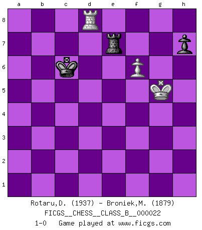 Last move : 1-0 2007 June 6 20:59:24 [Event "FICGS__CHESS__CLASS_B__000022"] [Site "FICGS"] [Date "2007.05.02"] [Round "1"] [White "Rotaru,Dan"] [Black "Broniek,Mariusz Maciej"] [Result "1-0"] [WhiteElo "1937"] [BlackElo "1879"] 1.d4 Nf6 2.c4 e6 3.Nc3 Bb4 4.Qc2 O-O 5.e4 d5 6.e5 Ne4 7.Bd3 c5 8.cxd5 exd5 9.Nge2 cxd4 10.Nxd4 Nd7 11.f4 Ndc5 12.O-O Bg4 13.h3 Nxd3 14.Qxd3 Bxc3 15.bxc3 Bd7 16.Ba3 Re8 17.c4 Qa5 18.cxd5 Qxd5 19.Rfe1 f5 20.Qb3 Qxb3 21.axb3 Kf7 22.g4 g6 23.Kg2 a5 24.Kf3 Rac8 25.Bb2 b6 26.Rxe4 fxe4+ 27.Kxe4 Rc5 28.b4 Bc6+ 29.Nxc6 Rxc6 30.bxa5 Rc4+ 31.Ke3 bxa5 32.Rxa5 Rb8 33.Bd4 Rd8 34.Ba1 Rb8 35.f5 Rb3+ 36.Kd2 Rxh3 37.e6+ Ke7 38.Ra7+ Kd6 39.Ra6+ Kc5 40.Ra5+ Kc6 41.e7 Kd7 42.Bf6 Re4 43.Bg5 Rd4+ 44.Ke2 Re4+ 45.Kf2 gxf5 46.gxf5 Rh5 47.Kf3 Re1 48.Ra7+ Ke8 49.Ra8+ Kd7 50.Rd8+ Kc6 51.Kg4 Rxg5+ 52.Kxg5 Rxe7 53.f6 1-0 Nimzo-Indian : Classical variation Kingside Castling by player Black (move 4) Kingside Castling by player White (move 12) 10 pieces endgame at move 45 : White KRBPP , Black KRRPP WHITE : King + 1 Rook 1 Bishop 2 Pawns BLACK : King + 2 Rooks 2 Pawns 9 pieces endgame at move 46 : White KRBPP , Black KRRP WHITE : King + 1 Rook 1 Bishop 2 Pawns BLACK : King + 2 Rooks 1 Pawn 8 pieces endgame at move 51 : White KRPP , Black KRRP WHITE : King + 1 Rook 2 Pawns BLACK : King + 2 Rooks 1 Pawn 7 pieces endgame at move 52 : White KRPP , Black KRP WHITE : King + 1 Rook 2 Pawns BLACK : King + 1 Rook 1 Pawn 6 pieces endgame at move 52 : White KRP , Black KRP WHITE : King + 1 Rook 1 Pawn BLACK : King + 1 Rook 1 Pawn Player White won this chess game. Follow this game move after move (download)Chess makes man wiser and clear-sighted. (Vladimir Putin) Um dein Spiel zu verbessern musst du zuallererst das Endspiel studieren, denn diese kann unabhängig studiert werden. Die Eröffnung und das Mittelspiel müssen immer in Bezug gesetzt werden zum Endspiel. (José Raúl Capablanca) Fischer es una tragedia del Ajedrez Americano a la par con Morphy y Pillsbury. (Mig Greengard) Un millionnaire : 'Monsieur Steinitz ! Vous ne participez aux tournois que pour l'argent, alors que moi je n'y viens que pour l'honneur.' Steinitz : 'Chacun joue pour ce qu'il n'a pas'... Unless I accept my faults I will most certainly doubt my virtues. (Hugh Prather)