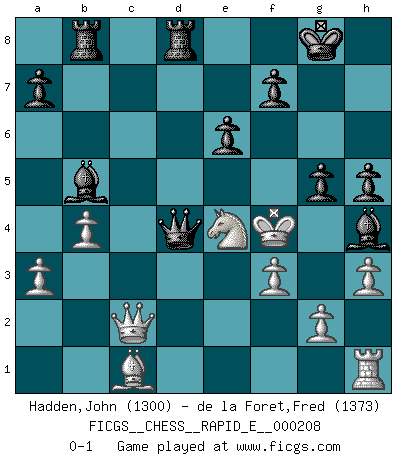 Last move : 0-1 2018 June 6 8:53:57 [Event "FICGS__CHESS__RAPID_E__000208"] [Site "FICGS"] [Date "2018.04.14"] [Round "1"] [White "Hadden,John"] [Black "de la Foret,Fred"] [Result "0-1"] [WhiteElo "1300"] [BlackElo "1373"] 1.d4 Nf6 2.c4 e6 3.Nc3 c5 4.Nf3 cxd4 5.Nxd4 Nc6 6.Nxc6 bxc6 7.e3 d5 8.cxd5 cxd5 9.Bd3 Bd7 10.Bd2 h5 11.h3 Rb8 12.b3 Bb4 13.a3 Be7 14.b4 O-O 15.e4 dxe4 16.Bxe4 Nxe4 17.Nxe4 Bc6 18.Qc2 Qd4 19.f3 Bh4+ 20.Kd1 Qxa1+ 21.Bc1 Rfd8+ 22.Ke2 Bb5+ 23.Ke3 Qd4+ 24.Kf4 g5+ 0-1 Queen's pawn game Kingside Castling by player Black (move 14) Player Black won this chess game. Follow this game move after move (download)A chess genius has died; a loss for humanity. (Viktor Kortchnoi, about Bobby Fischer's death) Er war ein guter Schachspieler, aber ich kann Leute nicht ausstehen, die 'Heil Hitler' rufen (Über Alexander Aljechin). (Miguel Najdorf) Cuando veas una buena jugada, trata de encontrar otra mejor. (Emanuel Lasker) Pour se monter efficace, un Cavalier a besoin d'avant-postes ! Les Cavaliers font les meilleurs bloqueurs de pions passés. When a man with money meets a man with experience, the man with experience leaves with money and the man with money leaves with experience. (Anonymous)