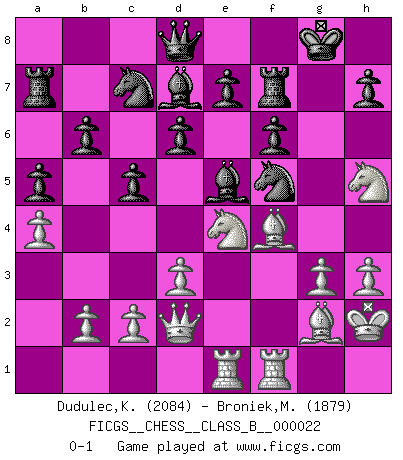 Last move : 0-1 2007 October 6 11:48:36 [Event "FICGS__CHESS__CLASS_B__000022"] [Site "FICGS"] [Date "2007.05.02"] [Round "1"] [White "Dudulec,Konstantin"] [Black "Broniek,Mariusz Maciej"] [Result "0-1"] [WhiteElo "2084"] [BlackElo "1879"] 1.e4 c5 2.Nc3 d6 3.Nge2 Nf6 4.g3 Nc6 5.Bg2 g6 6.h3 Bg7 7.d3 O-O 8.O-O Ne8 9.Be3 Nd4 10.f4 Nc7 11.Qd2 a5 12.Kh2 Ra6 13.a4 Bd7 14.Rab1 Ra7 15.f5 gxf5 16.Nf4 Be5 17.Nh5 f6 18.Bh6 Rf7 19.Rbe1 fxe4 20.Nxe4 Nf5 21.Bf4 b6 0-1 This chess game has been lost on time (started : 2007.05.02 10:28:57) Sicilian : Closed Kingside Castling by player Black (move 7) Kingside Castling by player White (move 8) Player Black won this chess game. Follow this game move after move (download)It is not a move, even the best move that you must seek, but a realizable plan. (Eugene Znosko-Borovsky) Obwohl ich vom Stil her kaum zu den Priestern der Schachkunst gezählt werde, halte ich Schach doch für eine Kunst. (Tigran Petrosjan) Una buena ofensiva y una buena defensa, comienzan ambas con un buen desarrollo. (Bruce A. Moon) La menace est plus forte que l'exécution. (Aaron Nimzovitch) The real danger is not that computers will begin to think like men, but that men will begin to think like computers. (Sydney J. Harris)