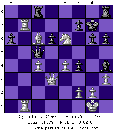 Last move : 1-0 2018 April 24 19:40:31 [Event "FICGS__CHESS__RAPID_E__000208"] [Site "FICGS"] [Date "2018.04.14"] [Round "1"] [White "Coggiola,Leandro Damian"] [Black "Bromo,Alexis"] [Result "1-0"] [WhiteElo "1268"] [BlackElo "1072"] 1.e4 e5 2.Nf3 Nc6 3.Bb5 d6 4.d4 a6 5.Ba4 b5 6.Bb3 h6 7.O-O Nf6 8.Re1 Bg4 9.c3 Be7 10.h3 Bh5 11.Qd3 Qd7 12.Nbd2 Bxf3 13.Nxf3 Nh5 14.Be3 Nf4 15.Bxf4 exf4 16.Bc2 O-O-O 17.a4 Na7 18.axb5 Qxb5 19.c4 Qb6 20.b4 Kd7 21.Ba4+ c6 22.d5 Qxb4 23.Reb1 Qc5 24.Rb7+ Ke8 25.dxc6 Nxc6 26.Nd4 Rc8 27.Rab1 Kf8 28.Nxc6 Bh4 29.Nd4 g6 30.Bc6 Kg7 31.Ne6+ 1-0 Ruy Lopez : Old Steinitz defense Kingside Castling by player White (move 7) Queenside Castling by player Black (move 16) Player White won this chess game. Follow this game move after move (download)The way he plays Chess demonstrates a man's whole nature. (Stanley Ellin) Ich verachte die Medien. (Robert James Fischer) Morphy probablemente fue el genio más grande de todos. (Bobby Fischer) Comme les marins qui ont mille raisons différentes d'aller en mer, les joueurs d'échecs en ont tout autant avant de s'installer devant une table et jouer... (Vincent Bertignac, philosophe) We're missing something. (Gregory House, House M.D.)