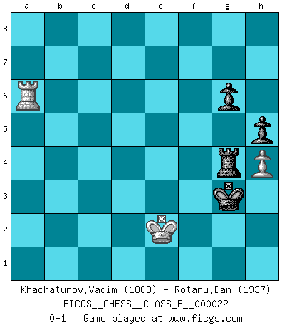 Last move : 0-1 2007 July 1 11:9:41 [Event "FICGS__CHESS__CLASS_B__000022"] [Site "FICGS"] [Date "2007.05.02"] [Round "1"] [White "Khachaturov,Vadim"] [Black "Rotaru,Dan"] [Result "0-1"] [WhiteElo "1803"] [BlackElo "1937"] 1.d4 Nf6 2.c4 e6 3.Nf3 Bb4+ 4.Bd2 Qe7 5.g3 Nc6 6.Nc3 Bxc3 7.Bxc3 Ne4 8.Rc1 d6 9.d5 Nxc3 10.Rxc3 Nb8 11.dxe6 fxe6 12.Bg2 O-O 13.O-O a5 14.Nd4 Kh8 15.f4 Nd7 16.e4 Nc5 17.e5 dxe5 18.fxe5 Rxf1+ 19.Qxf1 Bd7 20.Rf3 Kg8 21.Qf2 Qg5 22.Qe3 Qxe3+ 23.Rxe3 Ba4 24.Ra3 Rd8 25.Nxe6 Nxe6 26.Rxa4 Rd1+ 27.Kf2 Rd2+ 28.Kf1 b6 29.Bd5 Kf7 30.b4 axb4 31.h4 Ke7 32.Rxb4 Rxa2 33.Rb3 h6 34.Rd3 Nd8 35.Rb3 Nf7 36.Re3 Ra5 37.Ke2 b5 38.Bxf7 Kxf7 39.cxb5 Rxb5 40.Kf3 Ke6 41.Rc3 c5 42.Kf4 g6 43.Rc2 Rb4+ 44.Kf3 c4 45.Ke4 c3 46.Kd3 Rg4 47.Rg2 Kxe5 48.Rg1 Kd5 49.Rg2 h5 50.Rg1 c2 51.Kxc2 Ke4 52.Rf1 Rxg3 53.Kd2 Rg4 54.Rf6 Ke5 55.Ra6 Kf4 56.Ke2 Kg3 0-1 Bogo-Indian defense, Nimzovich variation Kingside Castling by player Black (move 12) Kingside Castling by player White (move 13) 10 pieces endgame at move 39 : White KRPPP , Black KRPPP WHITE : King + 1 Rook 3 Pawns BLACK : King + 1 Rook 3 Pawns 9 pieces endgame at move 47 : White KRPP , Black KRPPP WHITE : King + 1 Rook 2 Pawns BLACK : King + 1 Rook 3 Pawns 8 pieces endgame at move 51 : White KRPP , Black KRPP WHITE : King + 1 Rook 2 Pawns BLACK : King + 1 Rook 2 Pawns 7 pieces endgame at move 52 : White KRP , Black KRPP WHITE : King + 1 Rook 1 Pawn BLACK : King + 1 Rook 2 Pawns Player Black won this chess game. Follow this game move after move (download)Man is a frivolous, a specious creature, and like a Chess player, cares more for the process of attaining his goal than for the goal itself. (Dostoyevsky) Es ist schade, dass viele Schachsportler vergessen, wie wichtig Auftreten und angemessene Kleidung sind. (Alexandra Kosteniuk) Ser exitoso en el Ajedrez te permite descubrir tu propia personalidad. Eso es lo que deseo para los niños de mi clase. (Saudin Robovic) Il vaut mieux sacrifier les pièces de l'adversaire. (Xavier Tartacover) Now you put water in a cup, it becomes the cup; You put water into a bottle it becomes the bottle; You put it in a teapot it becomes the teapot. Water can flow or it can crash. Be water, my friend. (Bruce Lee)