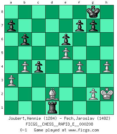 Last move : 0-1 2018 July 26 7:13:6 [Event "FICGS__CHESS__RAPID_E__000208"] [Site "FICGS"] [Date "2018.04.14"] [Round "1"] [White "Joubert,Hennie"] [Black "Pech,Jaroslav"] [Result "0-1"] [WhiteElo "1284"] [BlackElo "1482"] 1.e4 c6 2.d4 d5 3.Nd2 dxe4 4.Nxe4 Bf5 5.Ng3 Bg6 6.Nf3 Nd7 7.h4 h6 8.Bd3 Bxd3 9.Qxd3 e6 10.Bf4 Qa5+ 11.c3 Ngf6 12.O-O Be7 13.Rfe1 O-O 14.a3 Rfd8 15.Bd2 Bd6 16.Ne4 Nxe4 17.Qxe4 Qa4 18.Qg4 Nf6 19.Qh3 Qc2 20.Rab1 Bc7 21.Be3 Rd7 22.Rec1 Qg6 23.Ne5 Bxe5 24.dxe5 Nd5 25.Bd4 b6 26.Rd1 c5 27.Be3 Qe4 28.Qg3 Rad8 29.Bxh6 Qh7 30.Bg5 Nxc3 31.Rxd7 Qxb1+ 32.Kh2 Rxd7 33.Qxc3 Qd3 34.Qxd3 Rxd3 35.Be3 Rd1 36.f4 Rb1 37.b4 c4 38.Bd2 Rd1 0-1 Caro-Kann : 3.Nd2 Kingside Castling by player White (move 12) Kingside Castling by player Black (move 13) Player Black won this chess game. Follow this game move after move (download)All I want to do, ever, is just play Chess. (Bobby Fischer) Ohne ihre Erfolge schmälern zu wollen würde ich sagen Petrosian, Spassky und Karpov verdanken ihre Siege ihren Trainern - Boleslavsky, Bondarevsky und Furman. (Mikhail Moiseyevich Botvinik) ¿Cual es el objetivo de jugar una apertura de gambito?... Para adquirir una reputación de ser un jugador apuesto a costo de perder el juego. (Siegbert Tarrasch) Aucun coup ne doit être joué sans but. (Pedro Damiano) All maxims have their antagonist maxims; proverbs should be sold in pairs, a single one being but a half truth. (William Mathews)