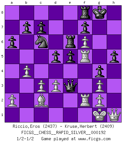 Last move : 1/2-1/2 2018 May 10 17:5:16 [Event "FICGS__CHESS__RAPID_SILVER__000192"] [Site "FICGS"] [Date "2018.04.14"] [Round "1"] [White "Riccio,Eros"] [Black "Kruse,Herbert"] [Result "1/2-1/2"] [WhiteElo "2437"] [BlackElo "2409"] 1.e4 e5 2.Nf3 Nc6 3.Bc4 Nf6 4.d3 Bc5 5.O-O d6 6.c3 O-O 7.Bg5 h6 8.Bh4 g5 9.Bg3 a6 10.Bb3 Ba7 11.Nbd2 Na5 12.Bc2 Nh5 13.b4 Nxg3 14.hxg3 Nc6 15.Nc4 Qf6 16.Ne3 Bxe3 17.fxe3 h5 18.Nh4 Qh6 19.Nf5 Bxf5 20.exf5 g4 21.f6 Qxe3+ 22.Kh2 Rae8 23.Rf5 Qh6 24.Qh1 Re6 25.Raf1 d5 26.Kg1 Qe3+ 27.R1f2 Qe1+ 28.Rf1 Qe3+ 29.R1f2 1/2-1/2 Two knights defense (Modern Bishop's Opening) Kingside Castling by player White (move 5) Kingside Castling by player Black (move 6) This chess game ended in a draw. Follow this game move after move (download)The stomach is an essential part of the Chess master. (Bent Larsen) Kein Großmeister ist normal. Sie unterscheiden sich nur im Ausmaß Ihrer Verrücktheit. (Viktor Kortschnoi) Tu sabes, camarada Pachman, no disfruto el ser un Ministro, preferería jugar al Ajedrez como tu. (Che Guevara) Aux échecs, les retours au sommet sont rares : les dommages psychologiques consécutifs à une défaite sont trop sévères. (Daily Telegraph) Life is like a play: it's not the length but the excellence of the acting that matters. (Seneca)