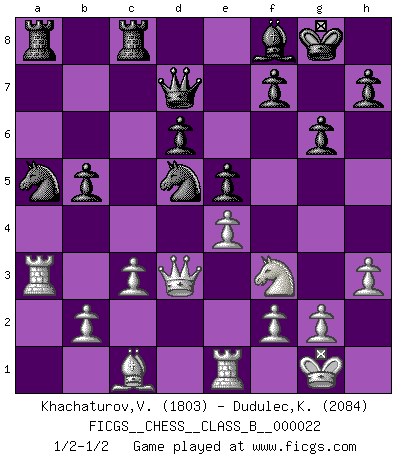Last move : 1/2-1/2 2007 August 17 0:9:20 [Event "FICGS__CHESS__CLASS_B__000022"] [Site "FICGS"] [Date "2007.05.02"] [Round "1"] [White "Khachaturov,Vadim"] [Black "Dudulec,Konstantin"] [Result "1/2-1/2"] [WhiteElo "1803"] [BlackElo "2084"] 1.e4 e5 2.Nf3 Nc6 3.Bb5 a6 4.Ba4 Nf6 5.O-O Be7 6.Re1 b5 7.Bb3 d6 8.c3 O-O 9.h3 Bb7 10.d4 Re8 11.Nbd2 g6 12.d5 Nb8 13.Nf1 c6 14.dxc6 Nxc6 15.Ne3 Na5 16.Bd5 Qd7 17.a4 Rec8 18.axb5 axb5 19.Ra3 Bf8 20.Qd3 Bxd5 21.Nxd5 Nxd5 1/2-1/2 Ruy Lopez : Closed Kingside Castling by player White (move 5) Kingside Castling by player Black (move 8) This chess game ended in a draw. Follow this game move after move (download)I won't play with you anymore. You have insulted my friend. - When an opponent cursed himself for a blunder. (Miguel Najdorf) Ich organisiere ein großes Turnier, was mich etwa 120000 Dollar kostet. Ich denke, das ist das erste Mal in der Schachgeschichte, daß ein Schachgroßmeister auch als Mäzen auftritt. (Miguel Najdorf) El tablero es el mundo, las piezas es el fenomeno del universo, las reglas del juego son lo que llamamos leyes de la naturaleza y el jugador del lado opuesto, se encuentra oculto a nuestra vista. (Thomas Huxley) Même si vous avez un bon coup à faire, regardez toujours s'il n'y en a pas un qui lui soit préférable. (Pedro Damiano) Tree pose grows confidence. It roots me to this world. (Terri Guillemets)