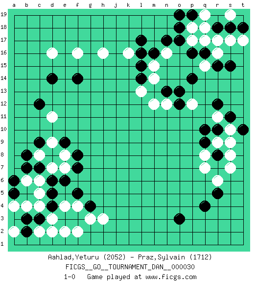 Last move : 1-0 2018 September 9 14:30:58 [Event "FICGS__GO__TOURNAMENT_DAN__000030"] [Site "FICGS"] [Date "2018.04.16"] [Round "1"] [Black "Aahlad,Yeturu"] [White "Praz,Sylvain"] [Result "1-0"] [Rating 1 "2052"] [Rating 2 "1712"] 1.q16 d16 2.q4 d3 3.d5 c5 4.d4 c4 5.e3 c6 6.d6 d7 7.c3 d2 8.b3 c2 9.c7 c8 10.b2 e2 11.b7 b6 12.b8 b4 13.f3 f2 14.c9 e7 15.f5 g3 16.g4 h3 17.f7 e8 18.c12 d11 19.f8 d9 20.e9 e4 21.e6 f4 22.a5 a4 23.a6 a2 24.d14 f16 25.f14 h16 26.o17 r6 27.r8 q8 28.q9 q7 29.r5 r9 30.r10 s9 31.q10 s10 32.s11 s7 33.t10 s8 34.o3 n16 35.n17 r16 36.r15 q17 37.p16 s17 38.s15 p18 39.r18 r17 40.s18 s19 41.t18 t17 42.o18 p17 43.p19 q19 44.o19 q18 45.m16 m15 46.l15 m14 47.l14 l13 48.l17 m12 49.n13 k16 50.l16 n12 51.o13 q15 52.p14 p12 53.o12 r11 54.r12 1-0 Here are the names of the openings (joseki) played in the four corners : Corner d4 : d3 d5 Komoku (Somok, Xiao~mu`) 3-4 Point. The komoku (3-4) point is the traditional corner enclosure move.. Ikken Takagakari (Hankan Nop'dakeolch'im, Yi Gaogua`jiao~, 1-Space High Approach). The 5-4 approach move has become more popular in modern times, as modern Go emphasizes speed and influence. Corner d16 : d16 c12 Hoshi (Hwajeom, Seongjeom, Xingwei`) 4-4 Point. The star or hoshi (4-4) point, emphasizing influence at the potential expense of territory. Corner q4 : q4 r6 Hoshi (Hwajeom, Seongjeom, Xingwei`) 4-4 Point. The star or hoshi (4-4) point, emphasizing influence at the potential expense of territory. Ikken Kakari (Hankan Keolch'im, Yi Gua`jiao~, 1-Space Low Approach). White 2 is the standard approach move to the 4-4. Player Black won this Go (weiqi, baduk) game. Follow this game move after move (download)White is always trying to kill a bigger group than black is trying to save. (Anonymous) Now be brave and don't look back. Don't look back. (Shmi Skywalker in Star Wars ep.1)