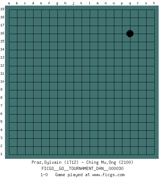 Last move : 1-0 2018 May 16 23:25:28 [Event "FICGS__GO__TOURNAMENT_DAN__000030"] [Site "FICGS"] [Date "2018.04.16"] [Round "1"] [Black "Praz,Sylvain"] [White "Ching Mu,Ong"] [Result "1-0"] [Rating 1 "1712"] [Rating 2 "2100"] 1.q16 1-0 This go game has been lost on time (started : 2018.04.16 15:54:41) Here are the names of the openings (joseki) played in the four corners : Player Black won this Go (weiqi, baduk) game. Follow this game move after move (download)The comb formation is alive. (Anonymous) Whoever said the pen is mightier than the sword obviously never encountered automatic weapons. (US General Douglas MacArthur)