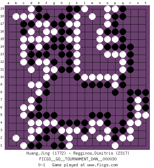 Last move : 0-1 2018 August 25 9:51:55 [Event "FICGS__GO__TOURNAMENT_DAN__000030"] [Site "FICGS"] [Date "2018.04.16"] [Round "1"] [Black "Huang,Jing"] [White "Regginos,Dimitris"] [Result "0-1"] [Rating 1 "1772"] [Rating 2 "2317"] 1.q16 d4 2.q4 d16 3.f3 c6 4.k4 o17 5.r14 k16 6.q10 c14 7.k10 r3 8.q3 r4 9.r5 s5 10.r6 s6 11.r7 s7 12.r8 h3 13.h4 j3 14.j4 k3 15.l3 l2 16.g3 m3 17.l4 n2 18.h2 j1 19.n5 o15 20.e18 d18 21.d17 e17 22.c17 c18 23.e16 f17 24.c16 d15 25.f18 b18 26.g17 f16 27.g15 f15 28.f14 g16 29.h16 e15 30.h17 k18 31.h14 g13 32.g14 j15 33.h15 k13 34.j12 d9 35.f9 d11 36.e7 d7 37.e6 q13 38.q14 o13 39.p18 o18 40.p17 k12 41.j11 l10 42.l9 m10 43.m9 n10 44.n9 o3 45.o4 m4 46.m5 o10 47.o9 d3 48.s8 q2 49.p2 r2 50.p3 o2 51.e2 d2 52.r12 p10 53.q9 q12 54.r13 q11 55.r11 f10 56.g10 e9 57.f8 f11 58.f13 g11 59.h11 p19 60.q19 o19 61.q18 p1 62.d13 c13 63.d1 c1 64.e1 b2 65.j18 f4 66.f5 e3 67.f2 g4 68.g5 e4 69.g1 j2 70.h1 n4 71.o5 k11 72.h13 k17 73.o16 n16 74.p16 n15 75.p14 p13 76.o14 n14 77.j14 k14 78.t7 d6 79.k19 l19 80.j19 m18 81.d12 c12 82.g12 p9 83.p8 e8 84.e5 j17 85.h18 e12 86.d14 c15 87.t6 s4 88.d5 c5 89.j16 k15 90.j13 t5 91.t8 p15 92.q15 d19 93.e19 f12 94.e13 e14 0-1 Here are the names of the openings (joseki) played in the four corners : Corner d4 : d4 f3 Hoshi (Hwajeom, Seongjeom, Xingwei`) 4-4 Point. The star or hoshi (4-4) point, emphasizing influence at the potential expense of territory. Ikken Kakari (Hankan Keolch'im, Yi Gua`jiao~, 1-Space Low Approach). Black 2 is the standard approach move to the 4-4. Corner q16 : q16 o17 Hoshi (Hwajeom, Seongjeom, Xingwei`) 4-4 Point. The star or hoshi (4-4) point, emphasizing influence at the potential expense of territory. Ikken Kakari (Hankan Keolch'im, Yi Gua`jiao~, 1-Space Low Approach). White 2 is the standard approach move to the 4-4. Corner q4 : q4 r3 Hoshi (Hwajeom, Seongjeom, Xingwei`) 4-4 Point. The star or hoshi (4-4) point, emphasizing influence at the potential expense of territory. Player White won this Go (weiqi, baduk) game. Follow this game move after move (download)Sacrifice for shape. (Anonymous) Wisdom begins at the end. (Daniel Webster)