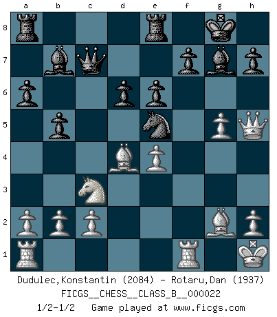 Last move : 1/2-1/2 2007 July 17 16:27:44 [Event "FICGS__CHESS__CLASS_B__000022"] [Site "FICGS"] [Date "2007.05.02"] [Round "1"] [White "Dudulec,Konstantin"] [Black "Rotaru,Dan"] [Result "1/2-1/2"] [WhiteElo "2084"] [BlackElo "1937"] 1.e4 c5 2.Nf3 d6 3.d4 cxd4 4.Nxd4 Nf6 5.Nc3 a6 6.g3 e6 7.Bg2 Qc7 8.O-O Be7 9.Be3 O-O 10.g4 Nc6 11.g5 Nd7 12.f4 Re8 13.Kh1 Nxd4 14.Bxd4 b5 15.f5 Ne5 16.f6 Bf8 17.fxg7 Bxg7 18.Qh5 Bb7 1/2-1/2 Sicilian : Najdorf, Zagreb (Fianchetto) variation Kingside Castling by player White (move 8) Kingside Castling by player Black (move 9) This chess game ended in a draw. Follow this game move after move (download)Blessed be the memory of him who gave the world this immortal game. (A. G. Gardiner) Wenn man heute mit 14 Jahren noch kein GM ist, kann man es vergessen. (Viswanathan Anand) Los tropiezos estan todos ahí en el tablero, esperando que se cometan. (Savielly Tartakover) Mon pion favori sur ma case favorite ! Bronstein en parlant d'un coup de pion en h5 quand il avait les Noirs. I find your interest interesting. (Gregory House, House M.D.)