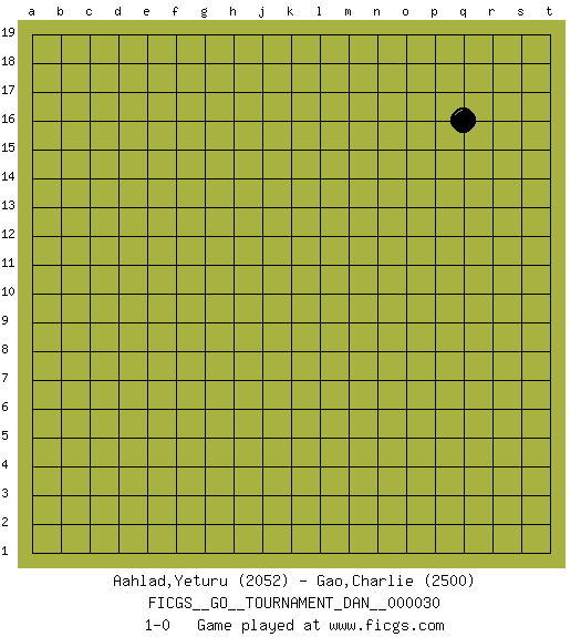 Last move : 1-0 2018 May 16 23:25:28 [Event "FICGS__GO__TOURNAMENT_DAN__000030"] [Site "FICGS"] [Date "2018.04.16"] [Round "1"] [Black "Aahlad,Yeturu"] [White "Gao,Charlie"] [Result "1-0"] [Rating 1 "2052"] [Rating 2 "2500"] 1.q16 1-0 This go game has been lost on time (started : 2018.04.16 15:54:41) Here are the names of the openings (joseki) played in the four corners : Player Black won this Go (weiqi, baduk) game. Follow this game move after move (download)If there is no stone on the handicap point, the carpenter's square is dead. (Anonymous) Man is reluctant to give credit for intelligence to anyone, except his enemies. (Albert Einstein)