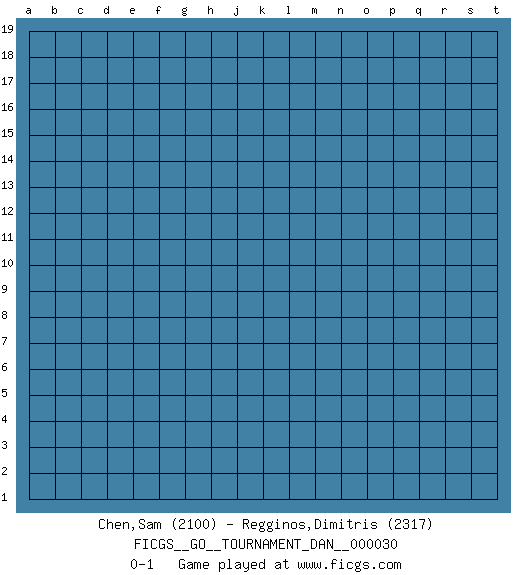 Last move : 0-1 2018 May 16 23:25:28 [Event "FICGS__GO__TOURNAMENT_DAN__000030"] [Site "FICGS"] [Date "2018.04.16"] [Round "1"] [Black "Chen,Sam"] [White "Regginos,Dimitris"] [Result "0-1"] [Rating 1 "2100"] [Rating 2 "2317"] 0-1 This go game has been lost on time (started : 2018.04.16 15:54:41) Here are the names of the openings (joseki) played in the four corners : Player White won this Go (weiqi, baduk) game. Follow this game move after move (download)Do not make moves that strengthen your opponent ! (Anonymous) Art is the only way to run away without leaving home. (Twyla Tharp)