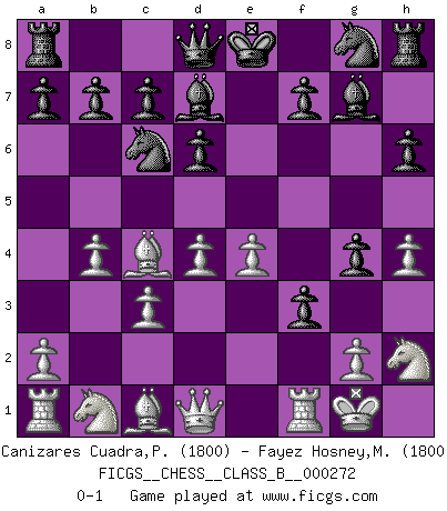 Last move : 0-1 2018 August 7 9:51:5 [Event "FICGS__CHESS__CLASS_B__000272"] [Site "FICGS"] [Date "2018.04.17"] [Round "1"] [White "Canizares Cuadra,Pedro"] [Black "Fayez Hosney,Mohammed"] [Result "0-1"] [WhiteElo "1800"] [BlackElo "1800"] 1.e4 e5 2.f4 exf4 3.Nf3 g5 4.Bc4 Bg7 5.O-O h6 6.d4 d6 7.h4 Nc6 8.c3 Bd7 9.b4 g4 10.Nh2 f3 0-1 This chess game has been lost on time (started : 2018.04.17 2:39:14) KGA : Hanstein gambit Kingside Castling by player White (move 5) Player Black won this chess game. Follow this game move after move (download)You can only get good at Chess if you love the game. (Bobby Fischer) Schach ist eine Sache der genauen Beurteilung, wann man zuschlagen und wann man sich ducken muss. (Robert James Fischer) El Ajedrez demanda una total concentración. (Bobby Fischer) Les échecs sont un jeu terrible. Si vous n'avez pas le centre, votre adversaire a une position plus libre. Par contre, si vous avez le centre, alors vous avez vraiment quelque chose pour laquelle vous inquiéter ! (Siegbert Tarrasch) The problem with manipulation is that people can turn on you. (Horatio Caine, C.S.I. Miami)
