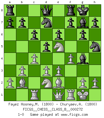 Last move : 1-0 2018 July 31 8:51:12 [Event "FICGS__CHESS__CLASS_B__000272"] [Site "FICGS"] [Date "2018.04.17"] [Round "1"] [White "Fayez Hosney,Mohammed"] [Black "Churyaev,Alexey"] [Result "1-0"] [WhiteElo "1800"] [BlackElo "1800"] 1.f4 Nf6 2.Nf3 g6 3.b3 Bg7 4.Bb2 d5 5.e3 Bg4 6.Be2 O-O 7.O-O Nbd7 8.c4 c6 9.d3 Nc5 10.Nbd2 Ncd7 11.Rc1 e6 12.Qe1 Nh5 13.Ne5 1-0 Bird's Opening Kingside Castling by player Black (move 6) Kingside Castling by player White (move 7) Player White won this chess game. Follow this game move after move (download)Excellence at Chess is one mark of a scheming mind. (Sir Arthur Conan Doyle) Unter Putin wird alles Geld aus Russland wie von einem Staubsauger nach Moskau umgeleitet, das ist wie ein schwarzes Loch. (Garry Kasparov) Cuando tengas duda... ¡juega al Ajedrez!. (Tevis) Avec des compensations pour le matériel en plus... (Anonyme) Before all elsed, be armed. (Niccolo Machiavelli)