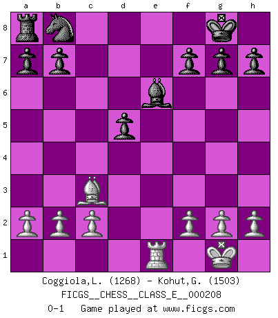 Last move : 0-1 2018 May 18 22:41:59 [Event "FICGS__CHESS__CLASS_E__000208"] [Site "FICGS"] [Date "2018.04.17"] [Round "1"] [White "Coggiola,Leandro Damian"] [Black "Kohut,Gregory"] [Result "0-1"] [WhiteElo "1268"] [BlackElo "1503"] 1.e4 e6 2.d4 d5 3.Nc3 Bb4 4.exd5 exd5 5.Nf3 Nf6 6.Bg5 O-O 7.Bd3 Re8+ 8.Be2 Qe7 9.Ne5 c5 10.O-O cxd4 11.Qxd4 Bxc3 12.Qxc3 Qxe5 13.Bxf6 Qxc3 14.Bxc3 Rxe2 15.Rfe1 Rxe1+ 16.Rxe1 Be6 0-1 French : Winawer (Nimzovich) variation Kingside Castling by player Black (move 6) Kingside Castling by player White (move 10) Player Black won this chess game. Follow this game move after move (download)It is the aim of the modern school, not to treat every position according to one general law, but according to the principle inherent in the position. (Richard Reti) Sicherlich können nur Meister einen Stil haben. Daß ein nicht-Meister auch nur ein einziges Mal in seinem Leben eine Partie folgerecht durchführte, habe ich niemals bemerkt. (Emanuel Lasker) Un entendimiento minucioso de las típicas continuaciones de mate hacen de las mas complicadas combinaciones de sacrificio que conducen hacia ellas no solo no dificiles, sino casi un asunto de rutina. (Siegbert Tarrasch) Un footballeur joue avec ses pieds, parfois avec sa tête. Un joueur d'échecs ne joue qu'avec sa tête. Et quand il ne joue plus, il meurt. (Jacob Murray) Players are not good because they find tactics, it is about the way to find the positions in which those tactics are hidden. (Luc-Olivier Leclerc)
