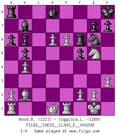 Last move : 1-0 2018 May 17 20:25:36 [Event "FICGS__CHESS__CLASS_E__000208"] [Site "FICGS"] [Date "2018.04.17"] [Round "1"] [White "Wood,Brian"] [Black "Coggiola,Leandro Damian"] [Result "1-0"] [WhiteElo "1221"] [BlackElo "1268"] 1.e4 e5 2.Nf3 Nc6 3.Bb5 a6 4.Ba4 b5 5.Bb3 Nf6 6.O-O Bc5 7.c3 O-O 8.h3 Bb7 9.d4 exd4 10.cxd4 Bb6 11.Bc2 d5 12.e5 Ne4 13.Nc3 f5 14.Nxd5 Kh8 15.Nxb6 cxb6 16.d5 Ne7 17.d6 Ng6 18.Re1 Nc5 19.b4 Ne4 20.Bxe4 Bxe4 21.Ng5 Bb7 22.e6 Rf6 23.Bb2 1-0 Ruy Lopez : Caro variation Kingside Castling by player White (move 6) Kingside Castling by player Black (move 7) Player White won this chess game. Follow this game move after move (download)I play correspondence chess because it is both art and science while chess is art only. (A player at FICGS) Ich verstehe mehr vom Schach als irgendein anderer lebender Meister. (José Raúl Capablanca) Fischer no está bajo la obligación de nadie. (Joseph Platz) Un millionnaire : 'Monsieur Steinitz ! Vous ne participez aux tournois que pour l'argent, alors que moi je n'y viens que pour l'honneur.' Steinitz : 'Chacun joue pour ce qu'il n'a pas'... Sometimes it pays to stay in bed in Monday, rather than spending the rest of the week debugging Monday's code. (Dan Salomon)