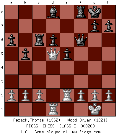 Last move : 1-0 2018 May 30 22:35:53 [Event "FICGS__CHESS__CLASS_E__000208"] [Site "FICGS"] [Date "2018.04.17"] [Round "1"] [White "Rezack,Thomas"] [Black "Wood,Brian"] [Result "1-0"] [WhiteElo "1362"] [BlackElo "1221"] 1.e4 c5 2.Nf3 d6 3.d4 cxd4 4.Nxd4 Nc6 5.Bb5 Bd7 6.O-O Nxd4 7.Bxd7+ Qxd7 8.Qxd4 e5 9.Qd1 Nf6 10.Re1 Be7 11.Bg5 O-O 12.Nc3 Rac8 13.Qd2 a6 14.Rad1 Rc6 15.Re2 b5 16.Bxf6 Bxf6 17.Nd5 Bd8 18.Qd3 f5 19.exf5 Qxf5 20.Nf6+ Qxf6 21.Qd5+ 1-0 Sicilian Kingside Castling by player White (move 6) Kingside Castling by player Black (move 11) Player White won this chess game. Follow this game move after move (download)Weak points or holes in the opponent's position must be occupied by pieces not Pawns. (Siegbert Tarrasch) Jeder weiß, dass Gasprom Putins persönliches Machtinstrument ist. Die Firma wird vom Kreml aus geleitet und wird schon deshalb nie transparent sein. (Garry Kasparov) Aquel que ve no otra dirección en el juego que la de dar Jaque Mate a su oponente, nunca será un buen jugador de Ajedrez. (Euwe) Votre seul travail dans les ouvertures est d'obtenir un milieu de partie jouable. (Lajos Portish) The hypothalamus is one of the most important parts of the brain, involved in many kinds of motivation, among other functions. The hypothalamus controls the 'Four Fs: Fighting, Fleeing, Feeding and Mating. (Unknown author)