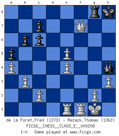 Last move : 1-0 2018 September 27 15:48:37 [Event "FICGS__CHESS__CLASS_E__000208"] [Site "FICGS"] [Date "2018.04.17"] [Round "1"] [White "de la Foret,Fred"] [Black "Rezack,Thomas"] [Result "1-0"] [WhiteElo "1373"] [BlackElo "1362"] 1.e4 e5 2.Nf3 Nc6 3.Bb5 a6 4.Bxc6 dxc6 5.O-O Bg4 6.h3 Bh5 7.d3 Bd6 8.Nbd2 Qe7 9.Nc4 Nf6 10.Ne3 O-O 11.Nf5 Qd7 12.Qe2 Qe6 13.Bd2 Rfe8 14.Qe3 a5 15.a4 b6 16.b3 h6 17.N3h4 Bf8 18.Qg3 Nxe4 19.dxe4 Rad8 20.Bxh6 g6 21.Bxf8 Rxf8 22.Rae1 Rd7 23.f4 Kh7 24.Qg5 gxf5 25.Qxh5+ Qh6 26.Qxf5+ Kh8 27.Qxd7 Qxh4 28.fxe5 Rg8 29.Qxf7 1-0 Ruy Lopez : Exchange variation, 5.O-O Kingside Castling by player White (move 5) Kingside Castling by player Black (move 10) Player White won this chess game. Follow this game move after move (download)Castle early and often. (Rob Sillars) Frage: Wie viele Autos haben Sie schon zerstört? - Antwort: Nur zwei. (Loek van Wely) Los problemas de Ajedrez exigen del compositor las mismas virtudes que caracterizan todo el arte de valor: originalidad, invención, concisión, armonía, complejidad e insinceridad explendida. (Vladimir Nabokov) Un journaliste : 'Vous préférez avoir une dame de plus sur l'échiquier ou au lit ?' Boris Spassky : 'Ca dépend de la position.' 'preceded by its own quotation yields a falsehood' preceded by its own quotation yields a falsehood. (W. V. O. Quine - Set Theory And Its Logic, 1953)